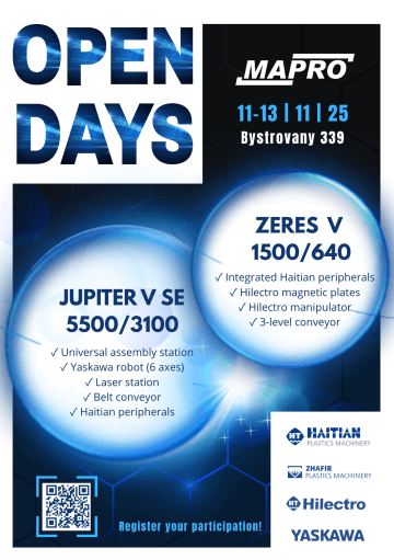 Během MAPRO OPEN DAYS 2025 představíme nejnovější technologická řešení pro automatizaci výroby – včetně vstřikovacích strojů Haitian, manipulačních systémů Hilectro a robotického pracoviště Yaskawa. Součástí programu bude ukázka univerzální montážní stanice, laserovací technologie a integrovaných periferií v reálném provozu.
