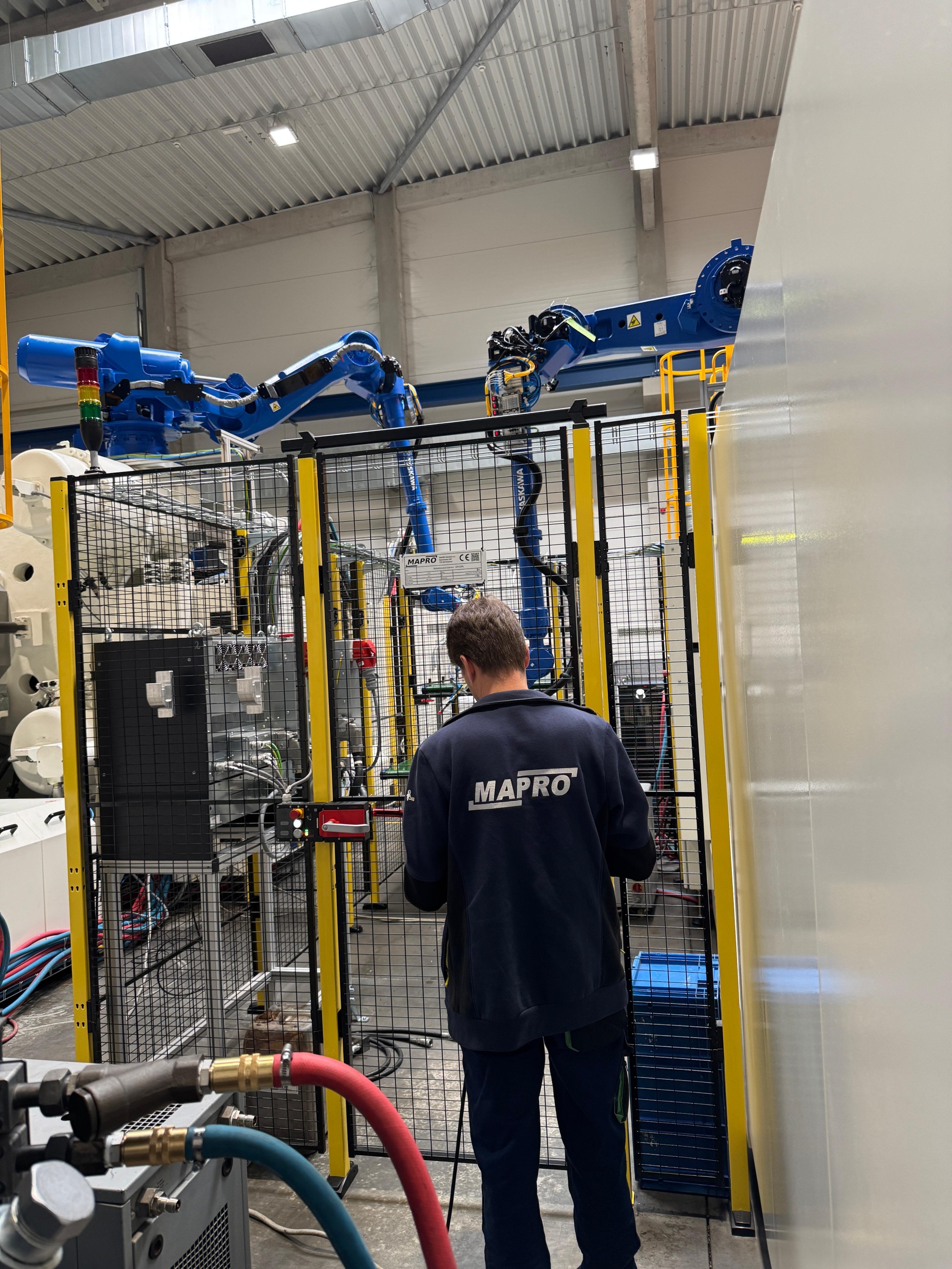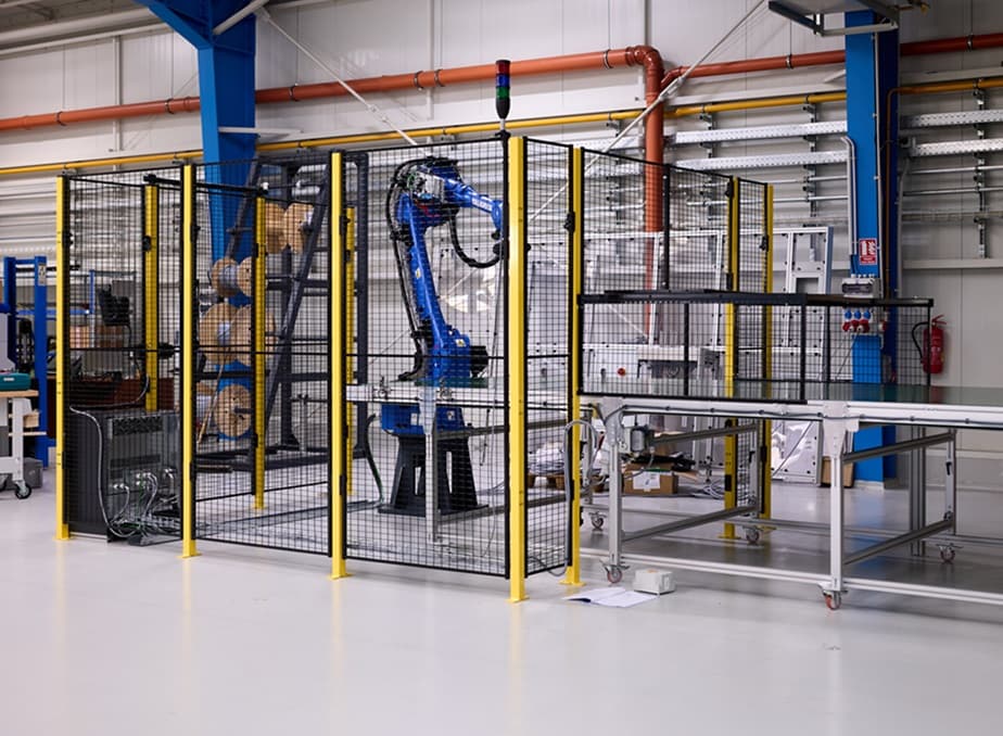 Robot, klec s bezpečností a dopravník jako základ robotizace pracoviště